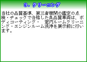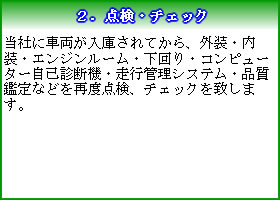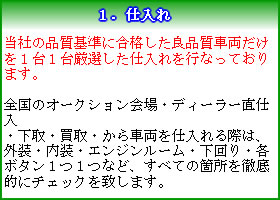 当社では、当社の品質基準に合格した厳選された良品質車だけを仕入れ、更に点検、整備、全装備品のチェックを行い厳しい基準を合格した良品質車だけを展示しております。